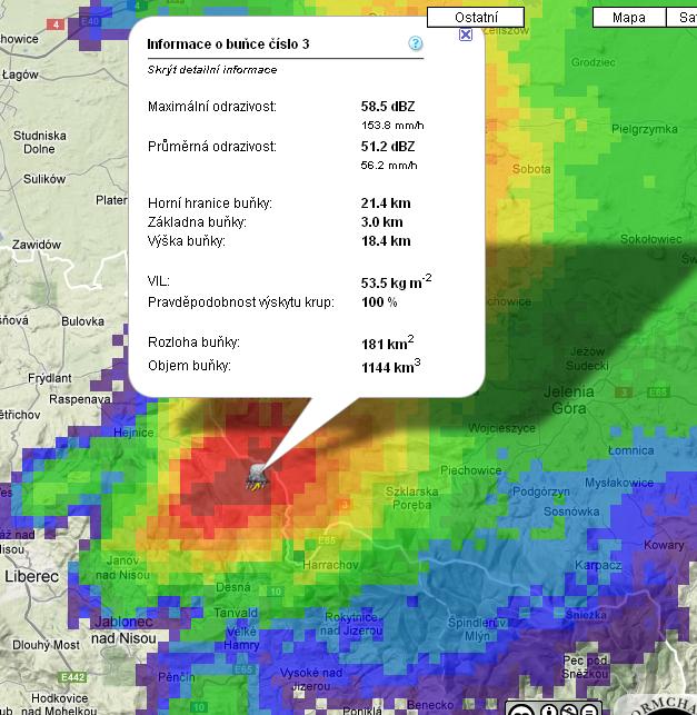 Tak jsem se vratil z Jizerky kde jsem byl od soboty a celkem jsem byl spokojen s touto bourkou, ktera mohla byt udajne i supercela! Co se tyce prubehu, tak nejdriv bylo slyset vzdalene hrmeni a postupne se zatahovalo a po asi 15-20min. prisel solidni vitr tak kolem 15m/s a stredne silny az silny dest a po chvilce se jeste pridali kroupy o prumeru cca 1-1.5cm a hlavne v solidnim mnozstvi ;) Jinak ale blesky byli nejak schovany v mracich, nebot nebylo temer nic slyset, krom toho predchoziho se bliziciho hrmeni a na pozorovani to taky nebylo idealni misto, ale i tak to bylo zajimave, hlavne co se tyce krup.
