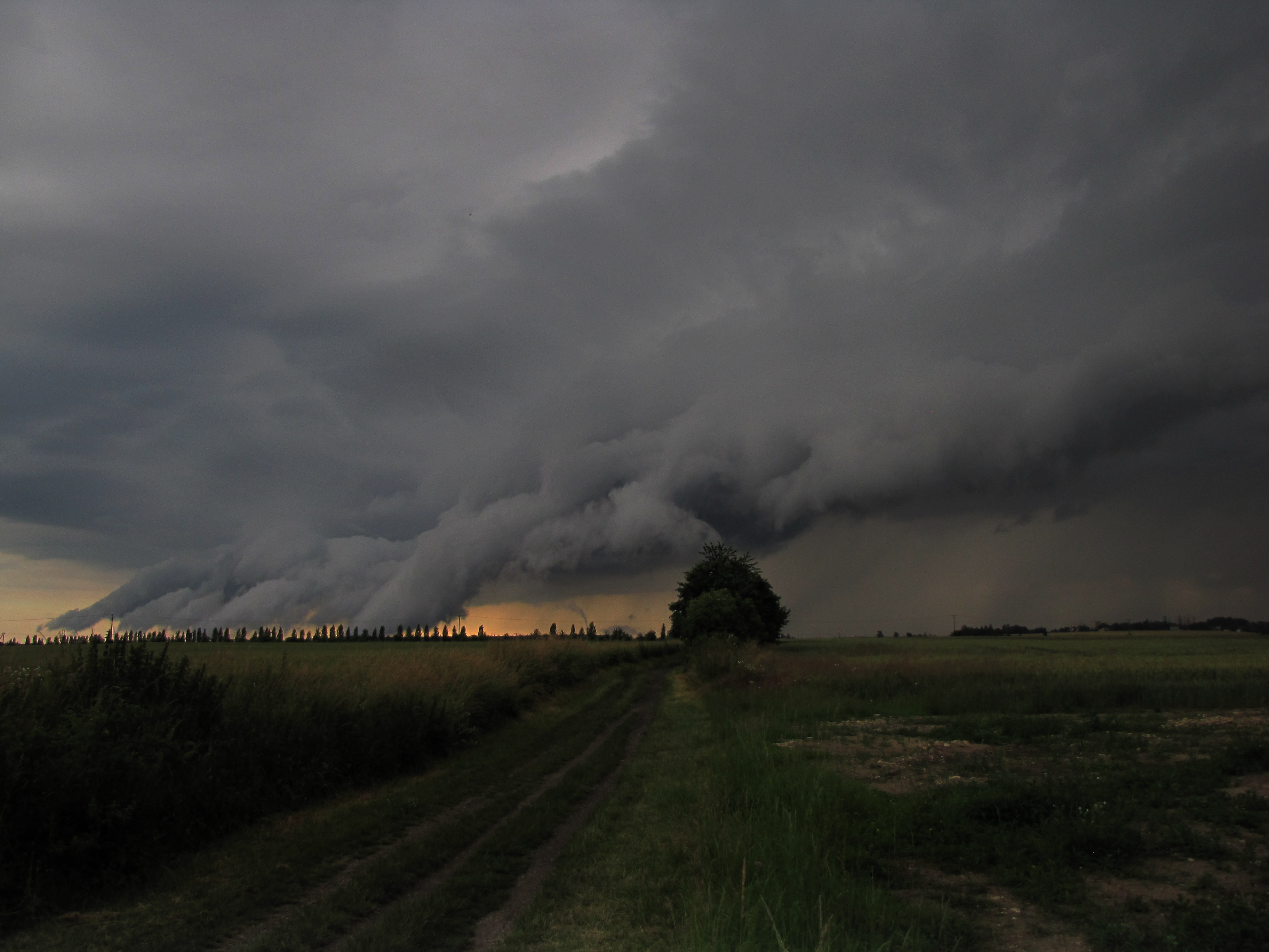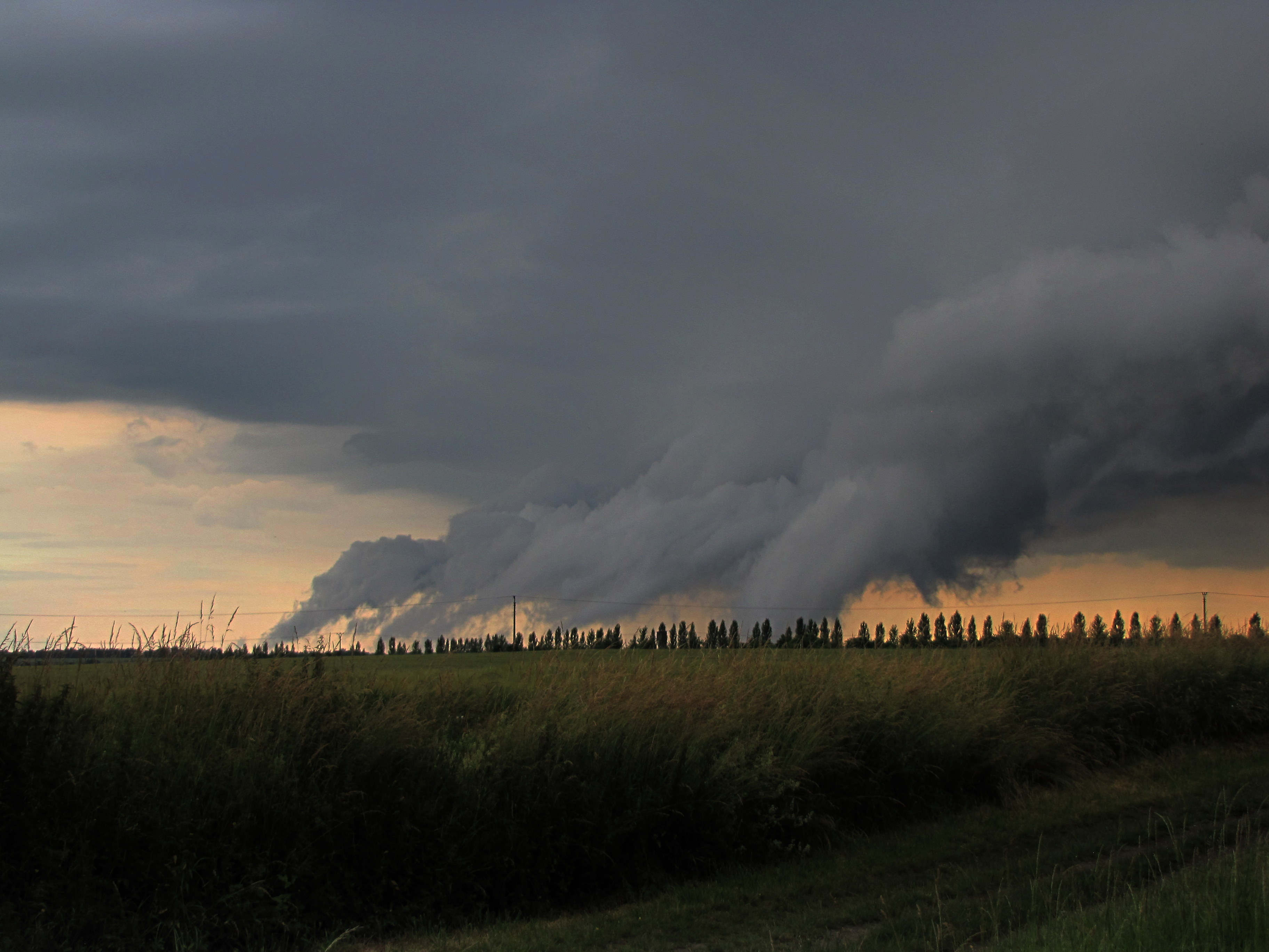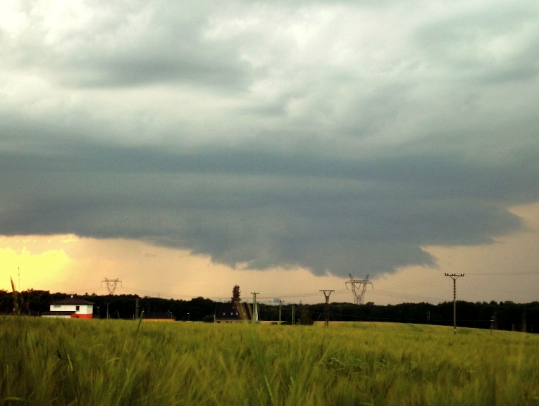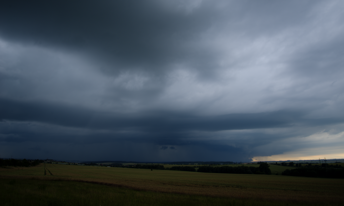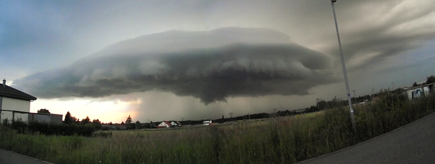 V 19:45 SELČ, když jsem se vracel z práce, dorazila od západu na Stochov takováhle nádhera. Na severu, kde byla bouřka nejsilnější, byla jen černota, ale jižní, rozpadající se křídlo bylo parádní. Za těch deset minut asi pět zahřmění, v 19:55 mě vyprovodil zpátky náraz větru ze směru postupu bouřky a spíš mrholení, než déšť. Teď, ve 20:30 SELČ, už neprší. Tohle můžu
