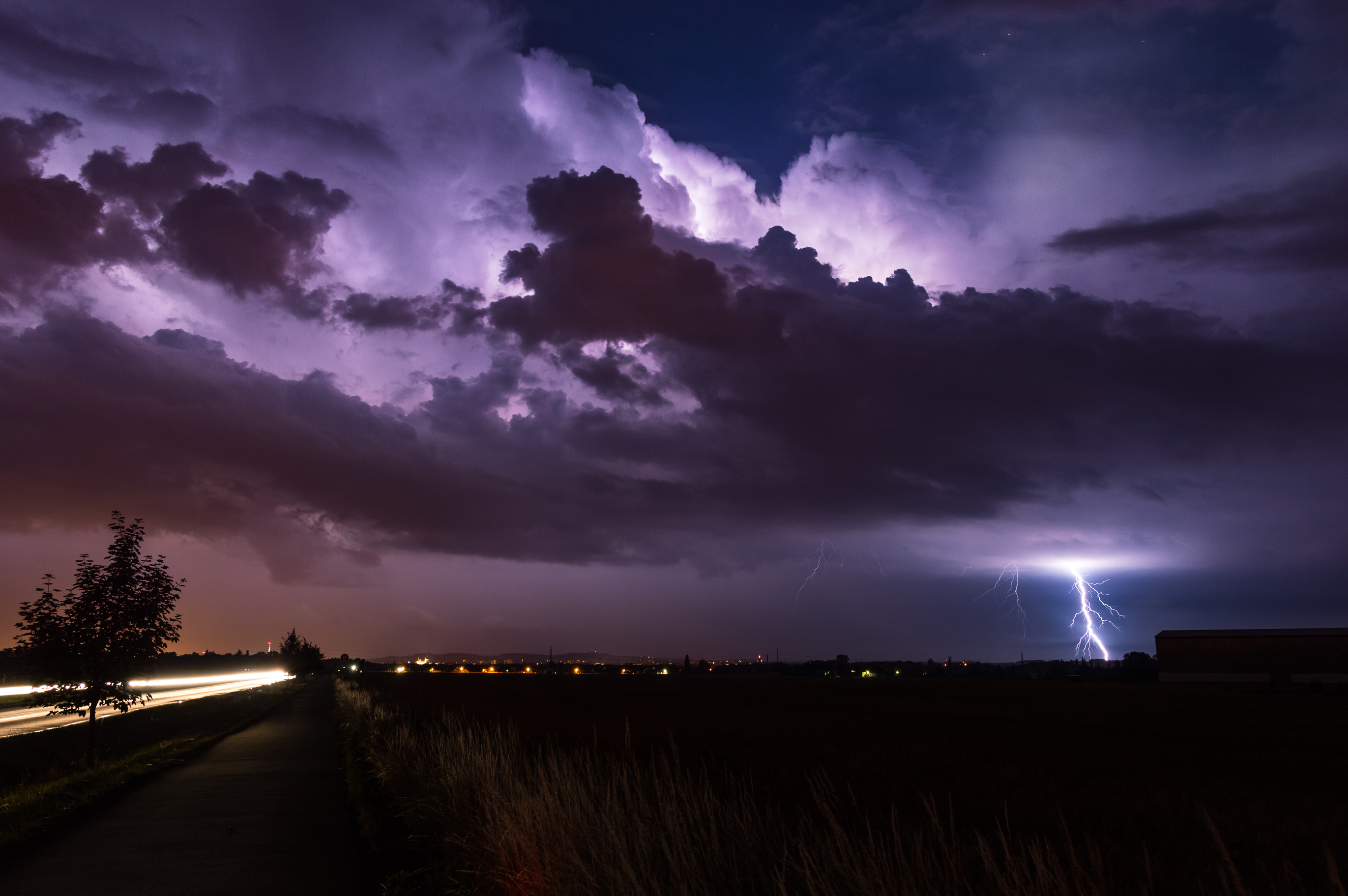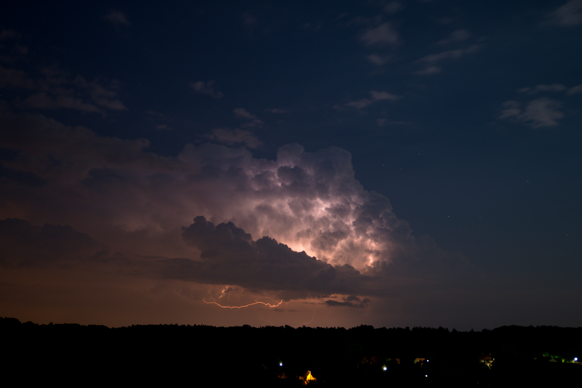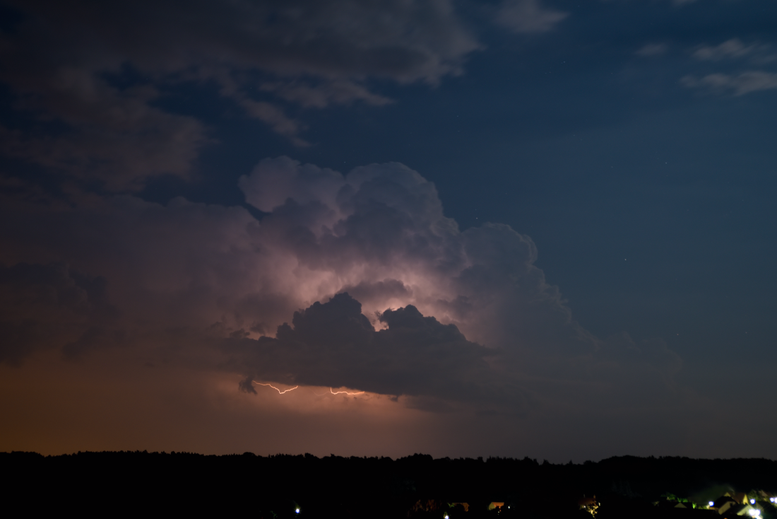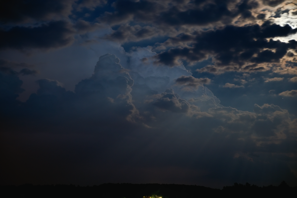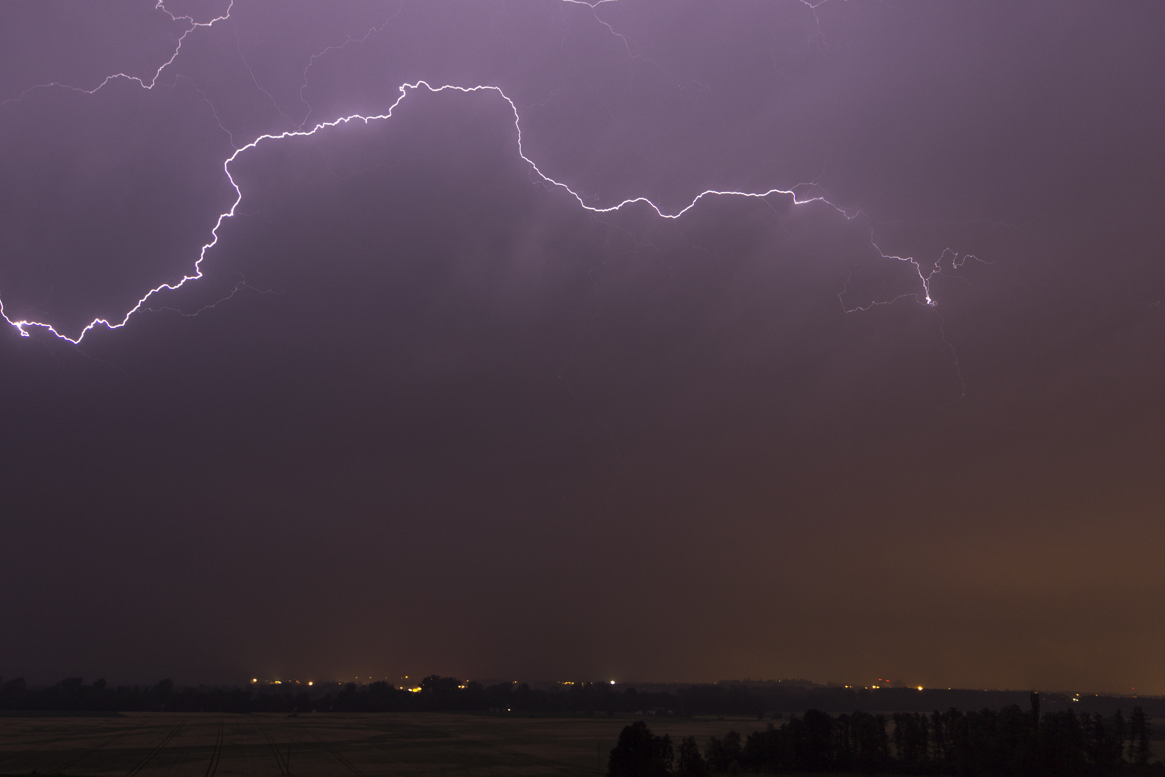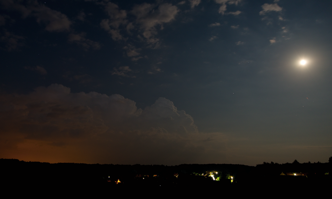 Přes den bouřky typicky začínaly vznikat až na východ od nás, takže to tady za nic nestálo. Odjel jsem na chatu, kde nemám data, ale byl jsem v pohotovosti. V první půlce noci se najednou objevila bouřka, která nás těsně minula, ale důležité pro mně byly její vrcholky krásně nasvícené měsícem. To je situace, která se stává opravdu málokdy. Bohužel balastní oblačnost se svým nepříznivým vlivem projevila více, než se mi původně zdálo, takže nakonec to žádný mimořídný úlovek nebyl. Navíc mraky postupovaly velice rychle, takže expozice nad 2 vteřiny byly tabu. I tak to ale stačí na článek.
