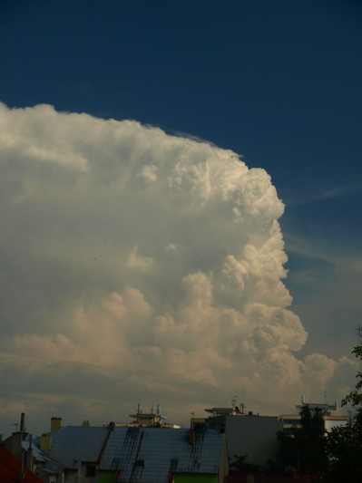 Tady nad centrem prahy snad už 2 hodiny! visí naprosto nehybná a neaktivní bouřka jejíž centrum je na jih od prahy a tam by podle radaru mohla být aktivita výrazná. tady jen občasně tiše hřmí. Na severu je jasno a je vidět nádherná kulisa cum. congestus osvětlená sluncem. jako kupa šlehačky