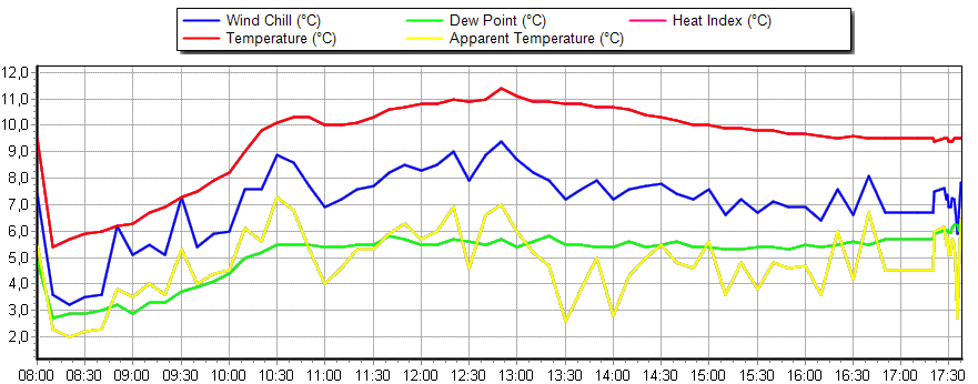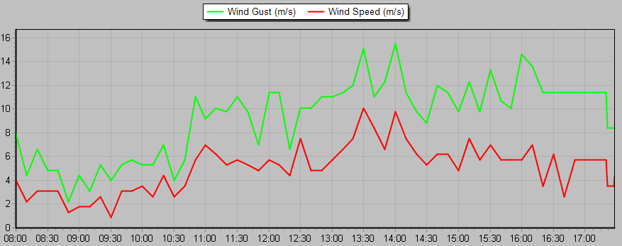 Ale k věci. U nás v Brodku u Prostějova dnešní den začal jen vánkem a teplotou kolem 5°C. Navzdory modelovým předpovědím, které tvrdily, že nejsilněji bude foukat v 10 a v 11:00 SEČ se rozfoukalo až kolem 13:00 a pořádný vítr začal foukat až ve 14:00. Nyní je tu zataženo s teplotou 9,9°C, vlhkostí 77% a čerstvým větrem o rychlosti 7,9 m/s, nejvyšší náraz za 10 minut je tu aktuálně 13,7 m/s, nejvyšší náraz za hodinu 15,9 m/s.