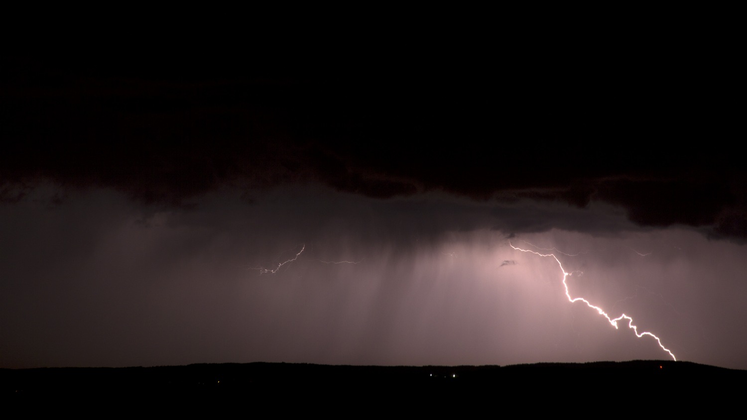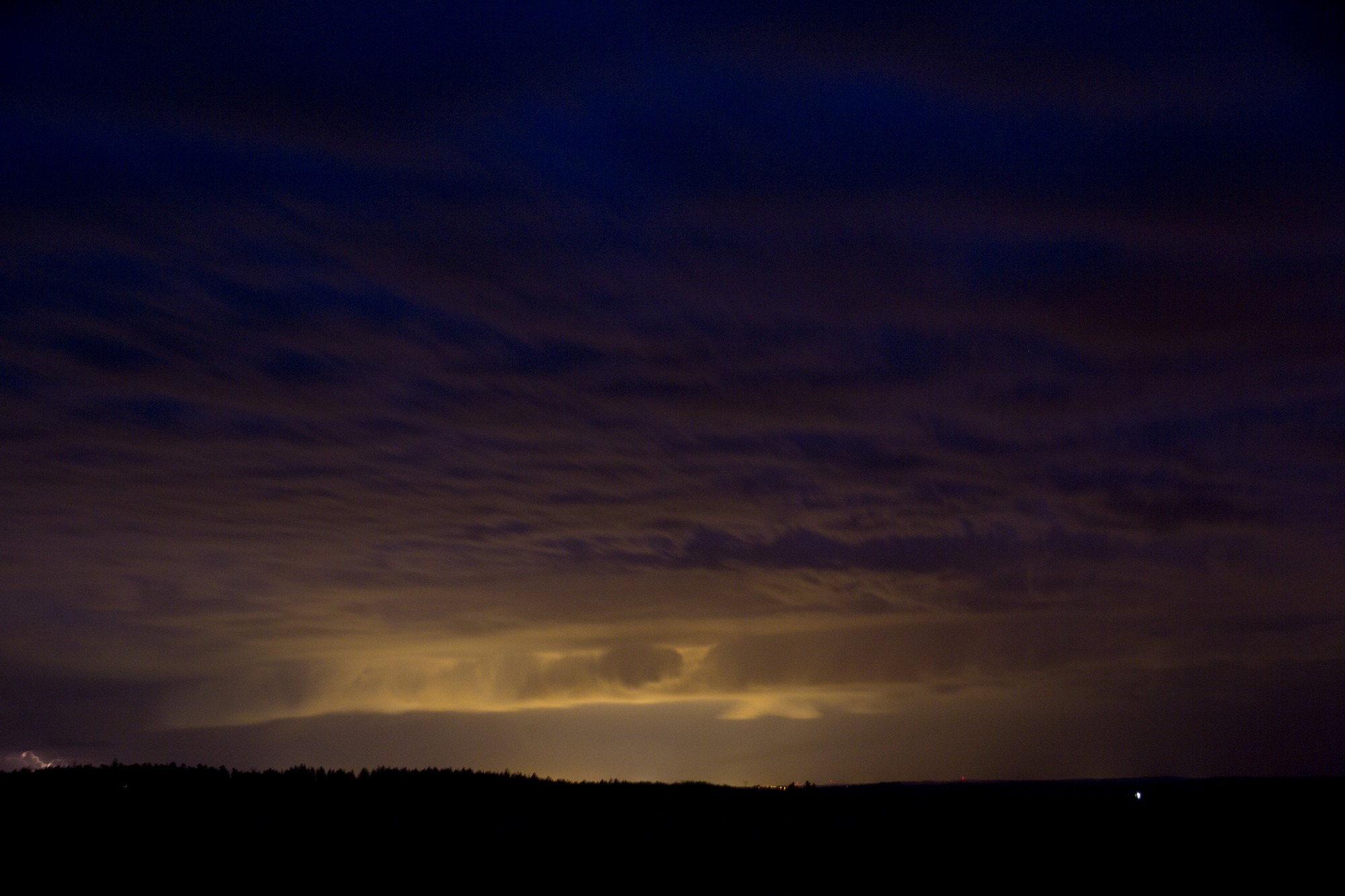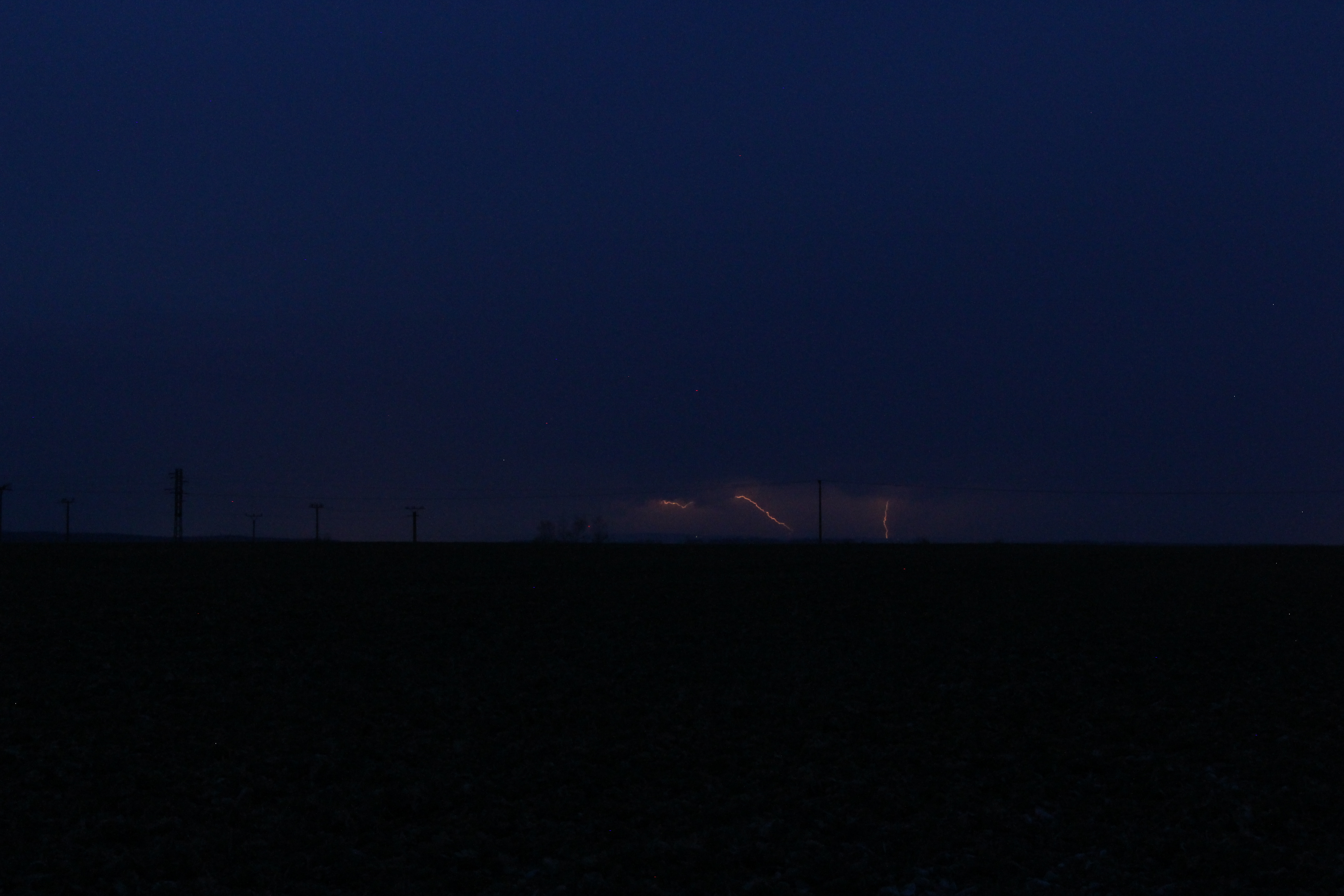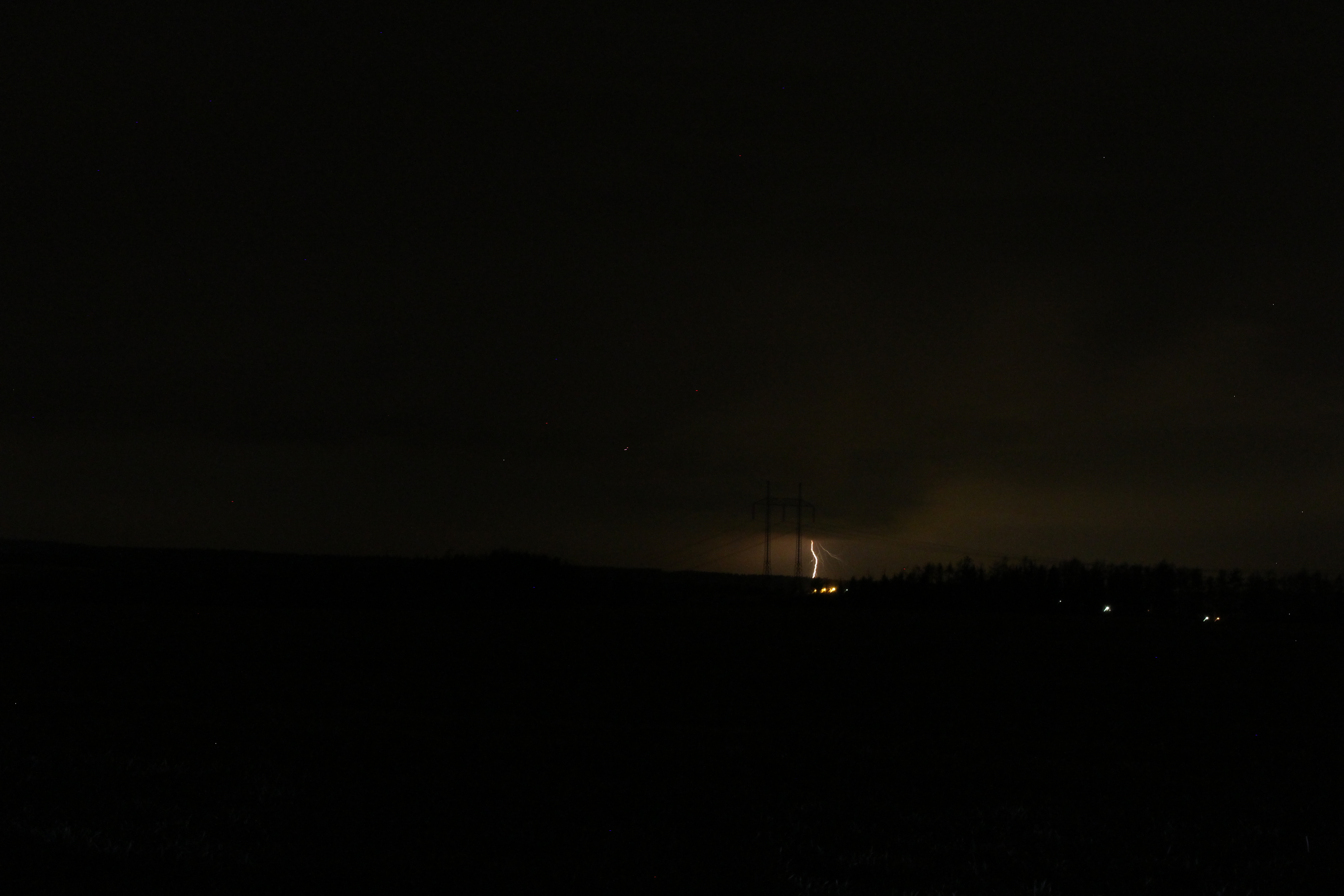 Já se musel spokojit "jen" s bohatou bleskovou nadílkou, co na tom, že drtivá většina blesků byla schovaná v mracích a že asi ze sta fotek bylo něco vidět jen na čtyřech. Při přechodu se jižní křídlo fronty rozpadlo úplně, trochu zapršelo, trochu fouklo, než jsem uklidil kolo a nádobí, už byla zase skoro jasná obloha. Ještě jsem si pohrával s myšlenkou jet pozorovat bouřku jdoucí po Krušnohoří, ale na to, jaká začala bejt zima (a pozdě), toho už bylo dost.