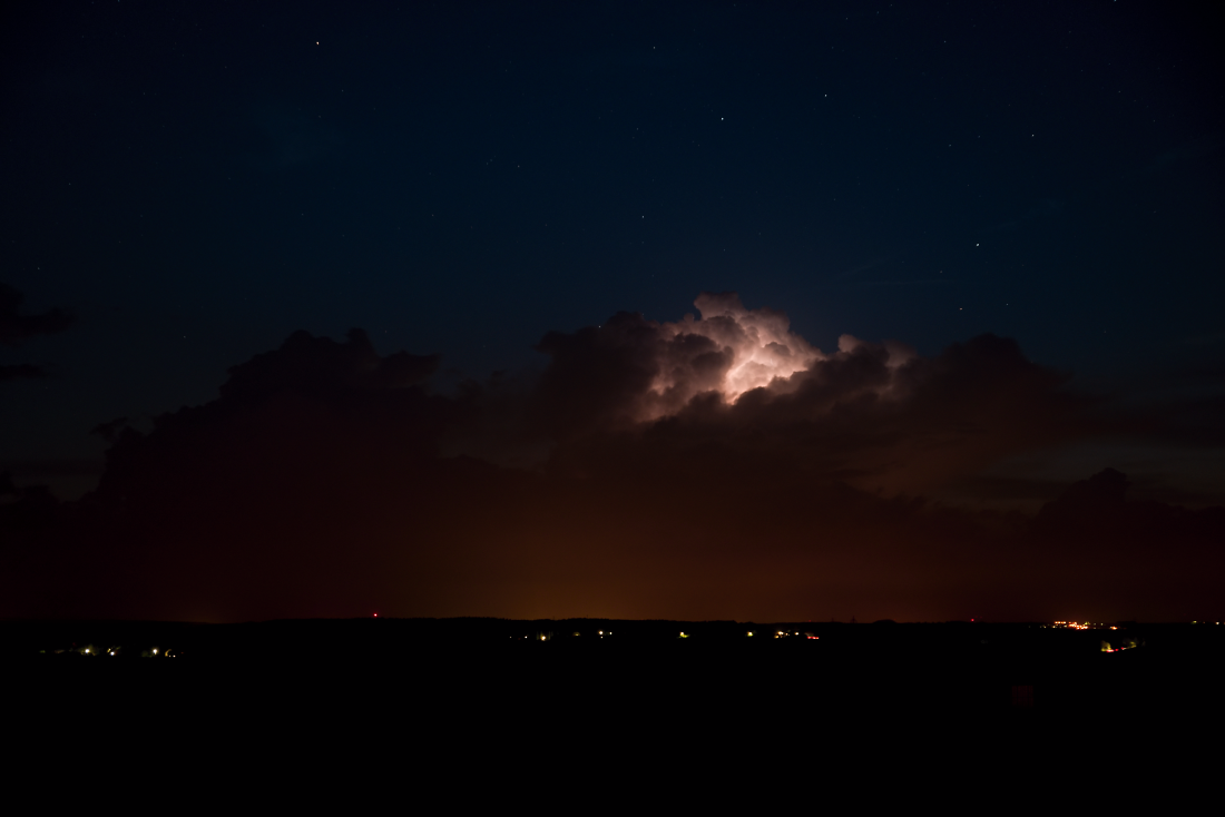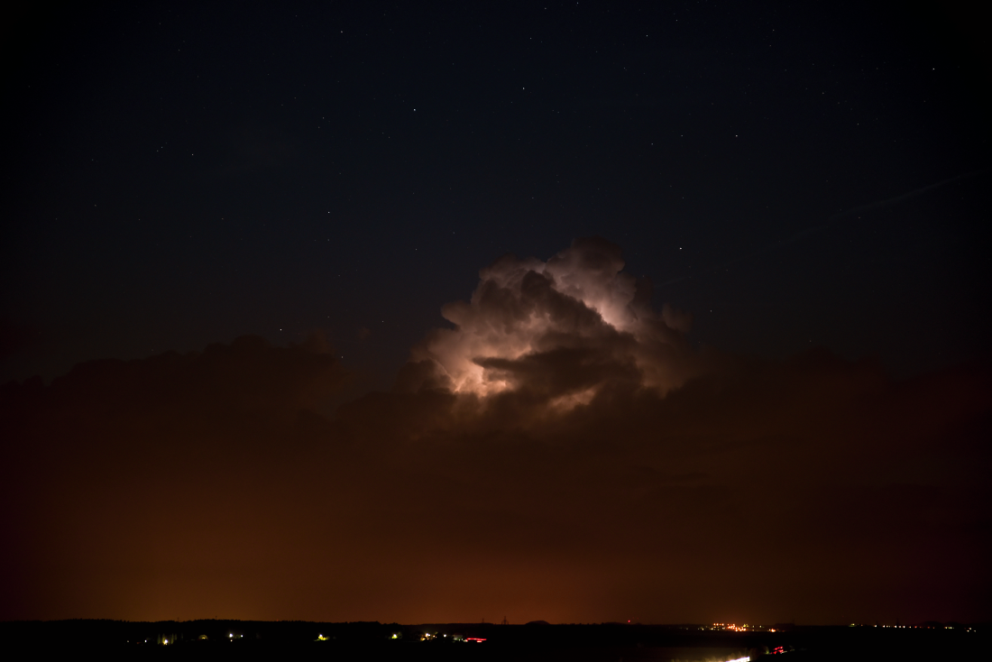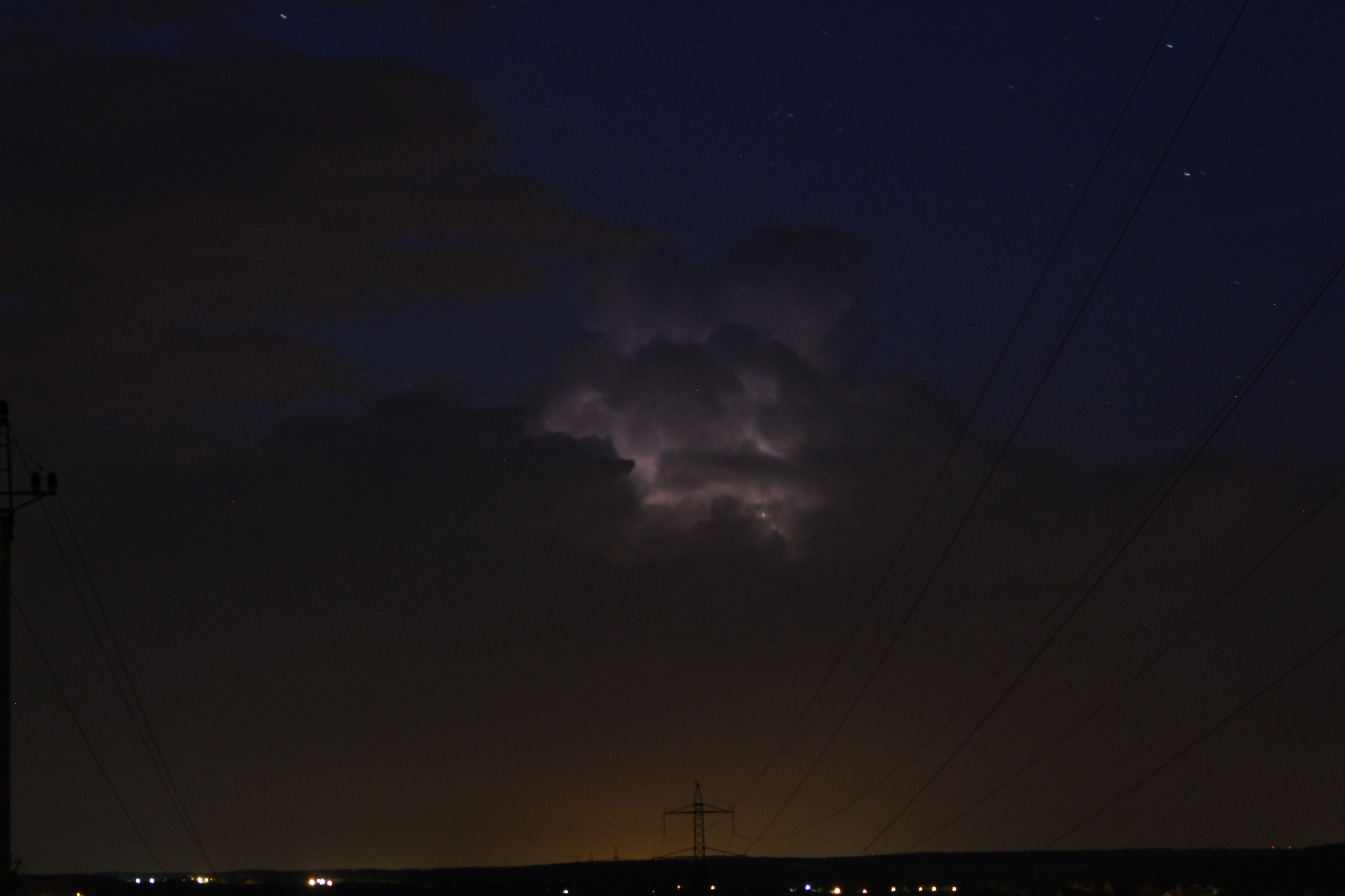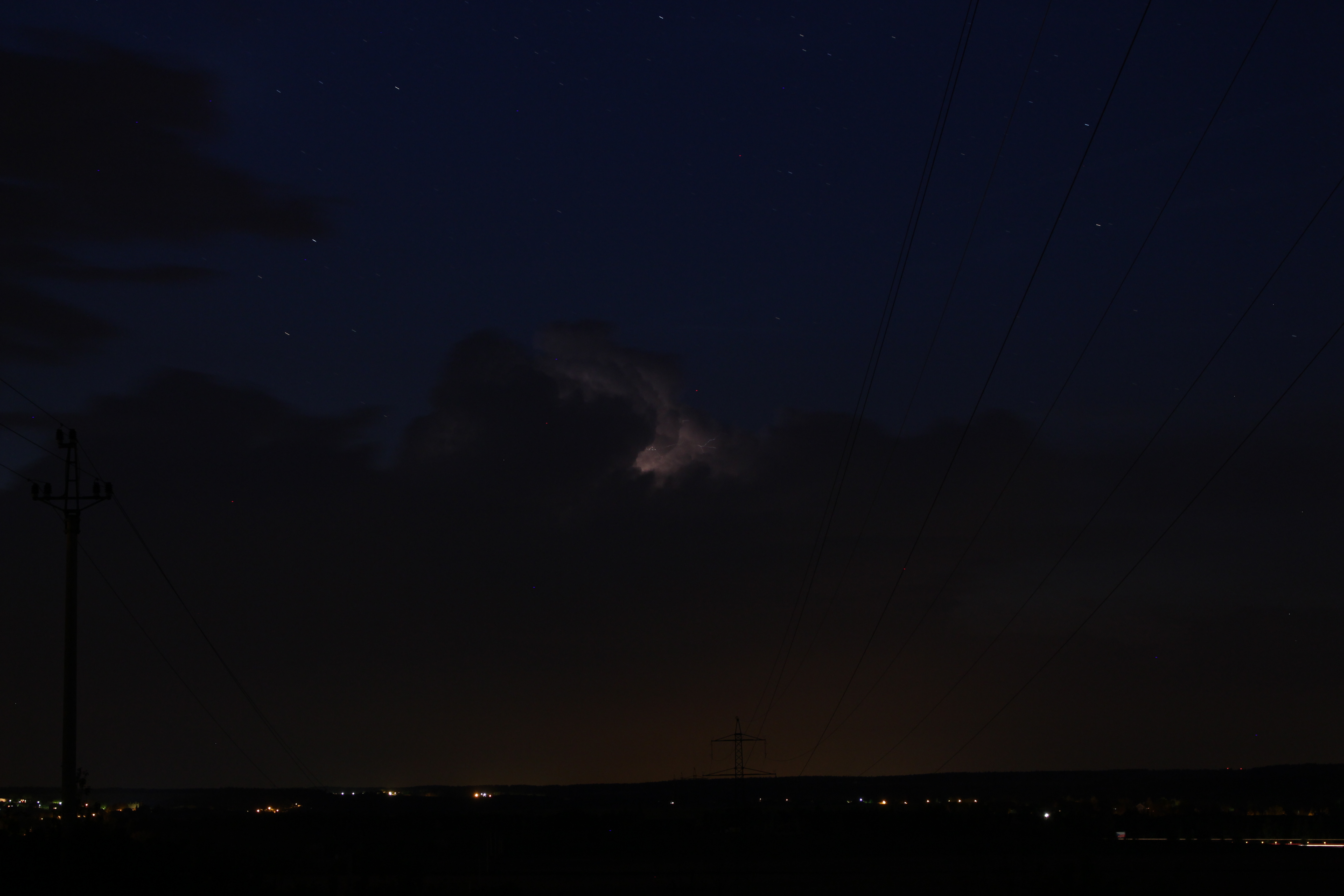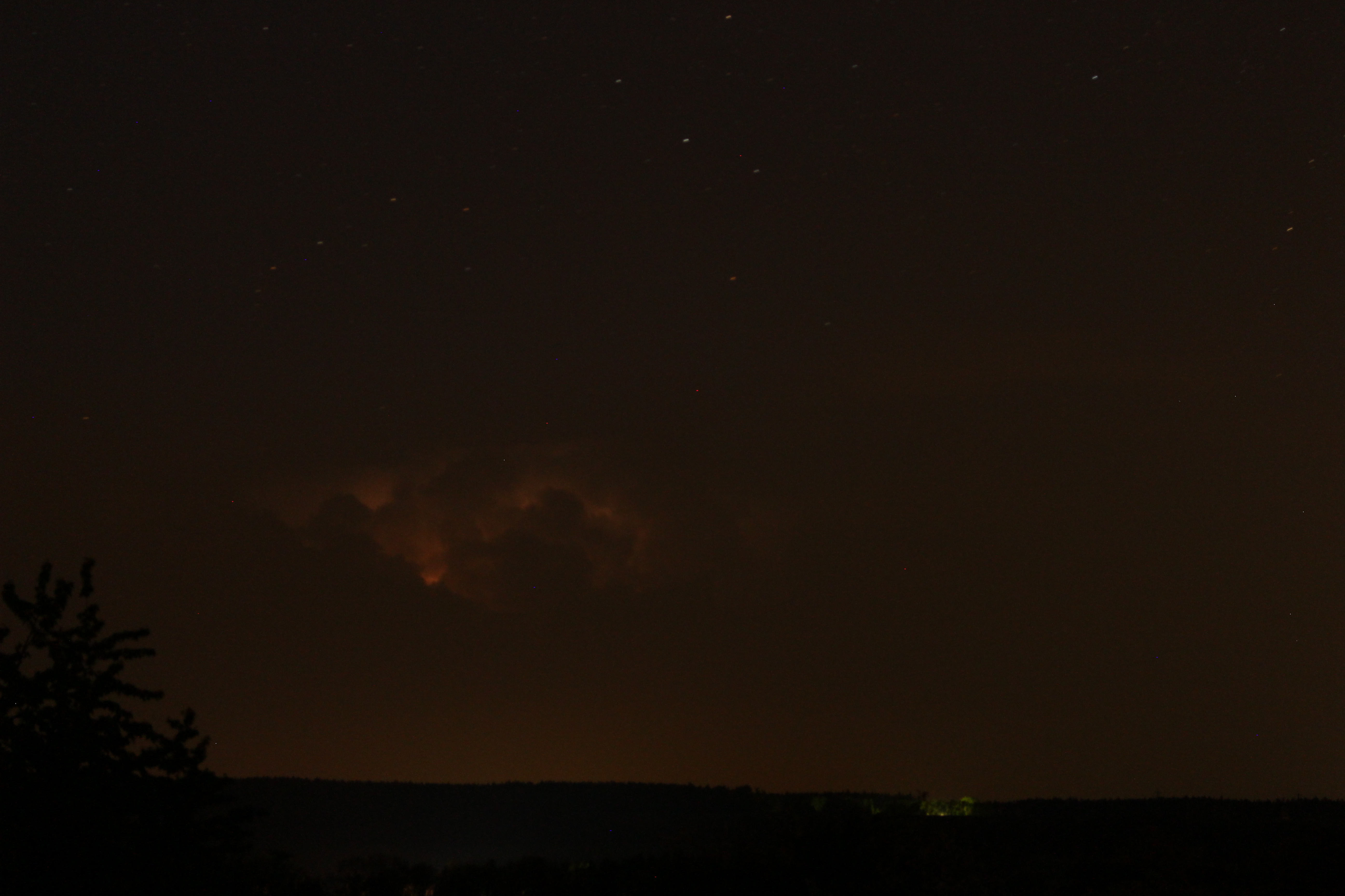 Normálně zírám. Zase 15% a zase bouřkový překvapení. Deprese, umocněná (snad) supercelou mířící z Rakouska, se kolem 18:00 SELČ začala pomalu rozplývat, když i nad Prahou najednou nesměle vybublal první cébáček. Vybublal a chcípnul. S končícím dnem najednou začaly přibývat kumuly a kongesty. Vybublaly a v řádu desítek minut zdechly. Pak najednou začaly bejt vidět na radaru, pak do nich i detekce začala sázet první křížky. Kolem 21:00 jsem to nevydržel a vydal se závratných 500m k místnímu hřbitovu, odkud bylo pěkně vidět na právě vzniklou řadu přeháněk na severu. Řada přeháněk se kupodivu hned nerozsypala, ale rostla dál a dál, a když jsem vybaloval foťák, začalo v ní blikat. Bez výjimky IC, asi jednou za minutu, pak se frekvence trochu zvýšila a rozblikaly se i vršky cb, co jsem měl na očích. Asi ve 21:30 se bouřka odmlčela, tak mě napadlo zajet domů pro mikinu a vyměnit baterku, protože jsem měl tušení, že to ještě nebude všechno. Vypínám foťák, "Sensor cleaning..." PLÁC! Do očí se mi vpálila věž cébáku kousek stranou na východ. Dobrý, kašlu na mikinu, akorát jsem vyměnil baterku a začal tím směrem pořizovat fotky. Neúspěšně, ale za to se rozblikala sílící přeháňka jdoucí kolem Loun. Všechno opět IC, 3-5x do minuty bílej záblesk v hlavici oblaku, bez bordelu kolem. Krásná bouřka. Jen ten plusák tomu chyběl...