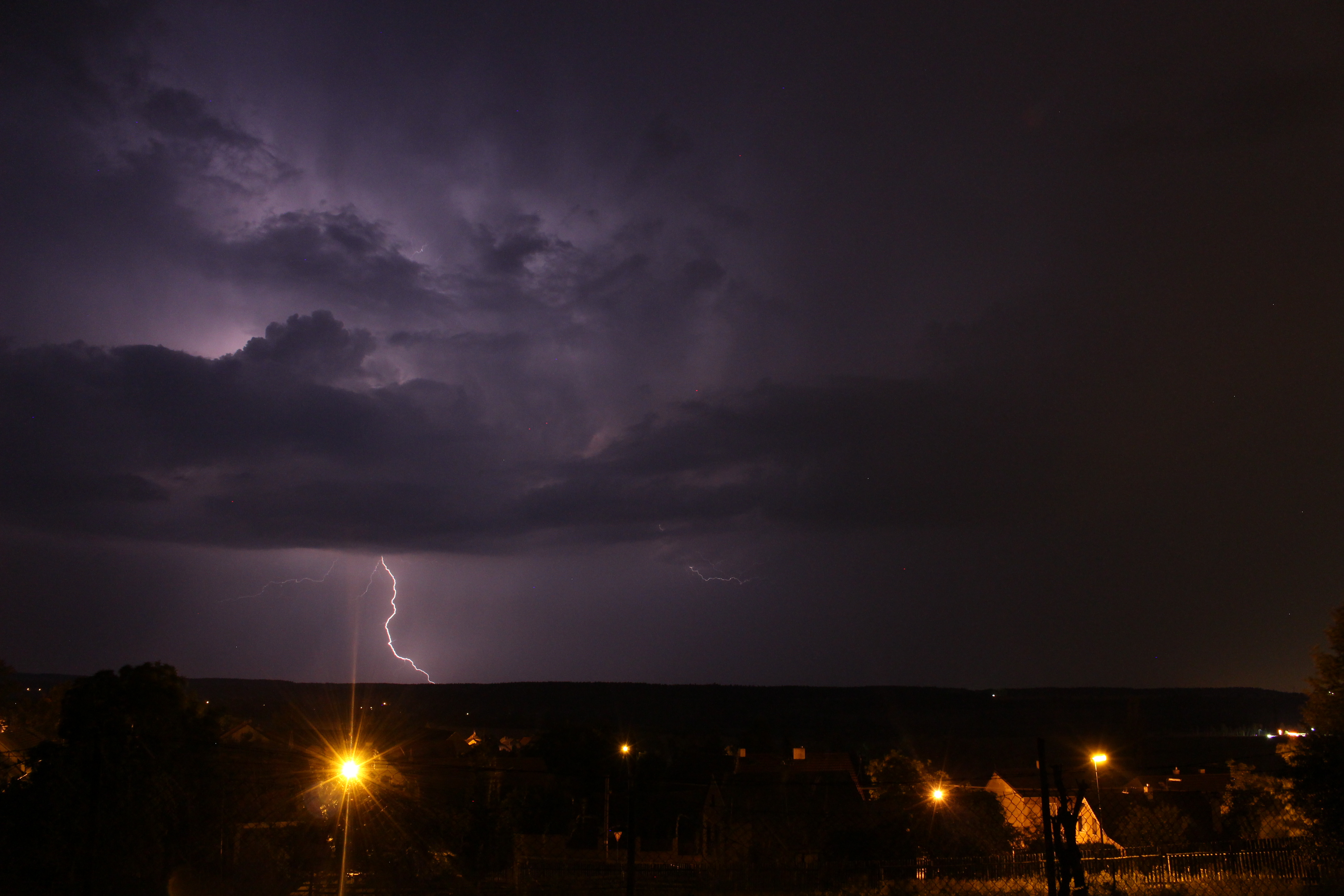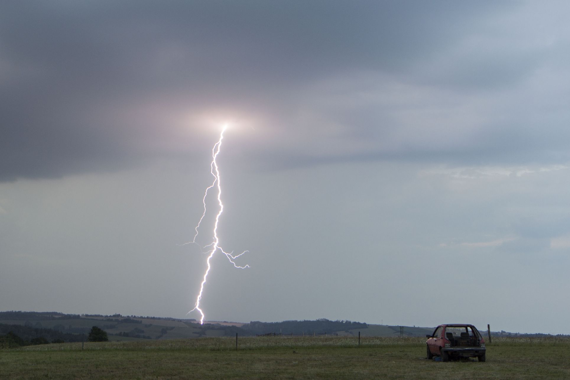 Večer, když už se stmívalo, mě na radaru upoutaly odrazy motající se na čáře cca Louny - Cheb. Zabalil jsem foťák a vyrazil na pole. Okouněl jsem tam minimálně půlhodinu a za tu dobu jsem se dočkal jen několika nesmělých IC, co by se daly spočítat na prstech. "Cože? To je všechno? Vždyť je to bouřka jako prase..." A najednou mě z úvah vytrhlo CGčko. Pohled na radar ukázal, že původní bouřka už skoro zanikla, ale za to se vytvořila, vnořená do okolní oblačnosti, malinká a nečekaně aktivní buňka a ta s frekvencí jednou do minuty začala sypat pěkný a blízký CG. Během čtvrt hodiny bylo po všem, tak jsem se mohl vydat k domovu konečně s pocitem, že nejedu s prázdnou.