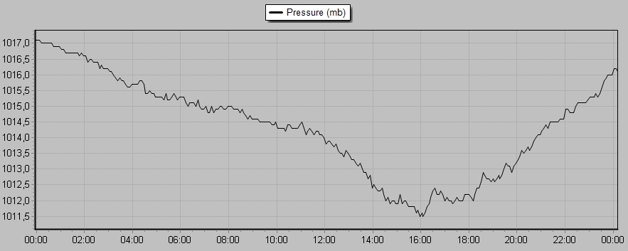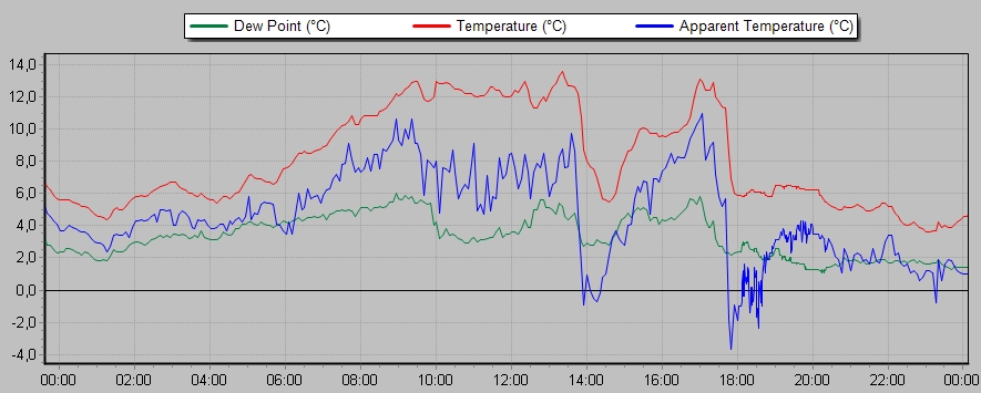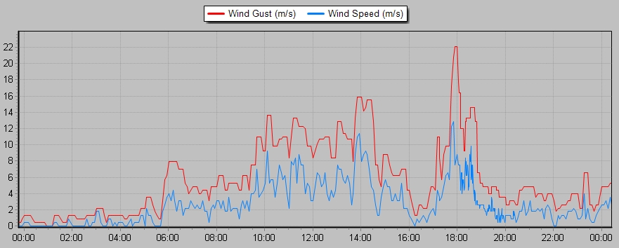 při příchodu miniaturního "shelfu" se vítr zvedl na 22,5 m/s, přičemž průměrná rychlost větru činila 12,9 m/s, od začátku dubna si tedy dělám druhou čárku na "silný vítr". Grafy pošlu zítra za celý dnešek.