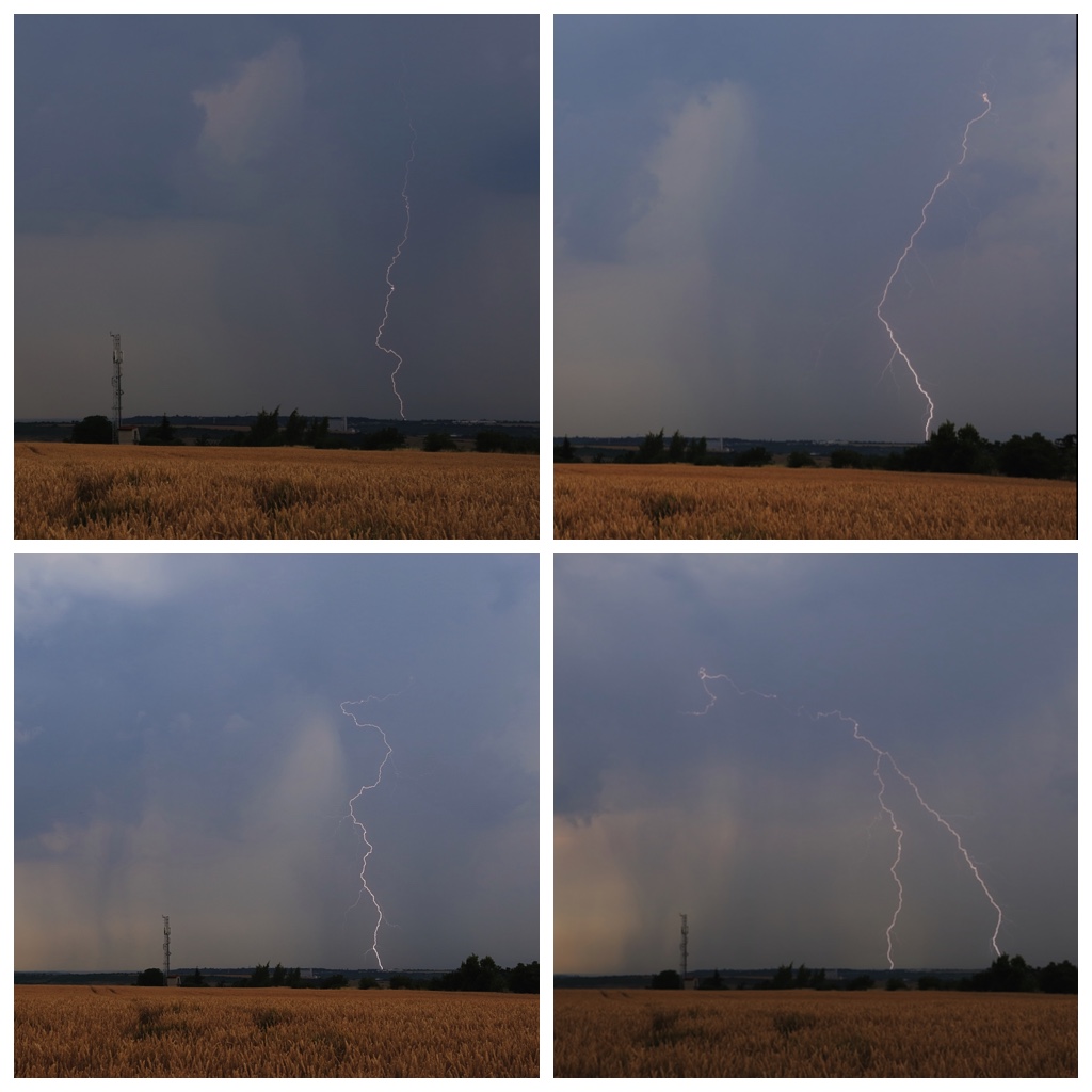 tento den byl spíš v očekávání toho, co přijde v noci, ale během odpoledne se prakticky přesně podle modelu Aladin zatáhlo konvektivní oblačností a v západní půlce Čech se vyrojily bouřky. Kolem Brandýska se jen párkrát zahřmělo, ale prakticky nespadla ani kapka nebo spíš jen neměřitelné množství, přesto neorganizovaný shluk bouřek dal vzniknout relativně krátce žijící bouřkové buňce u města Slaný, kterou jsem se jal fotit z oblíbeného místa na Rovinách nad naší obcí.