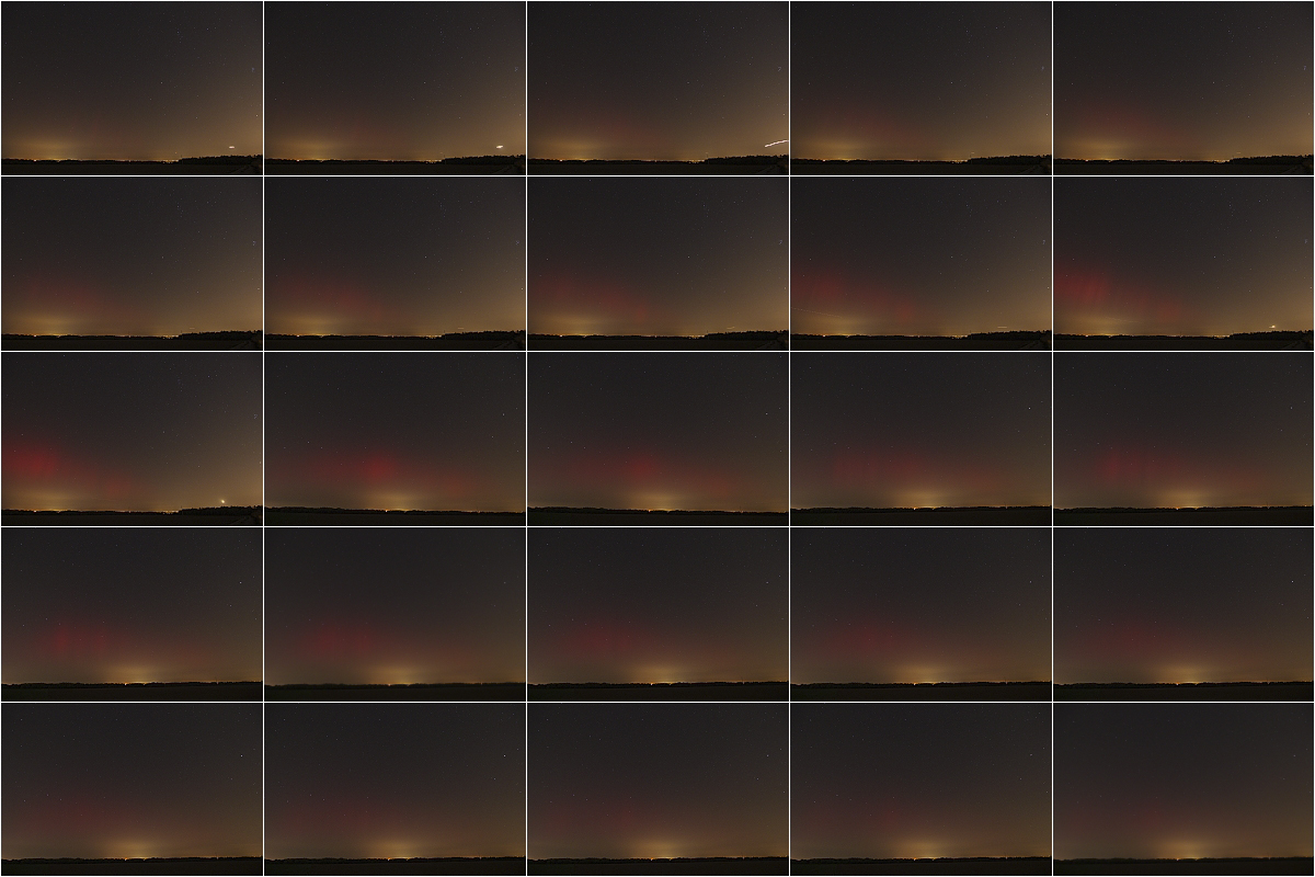 Vývoj polární záře od 23:15 a postupný zánik (doba expozice každé fotky je 30s)