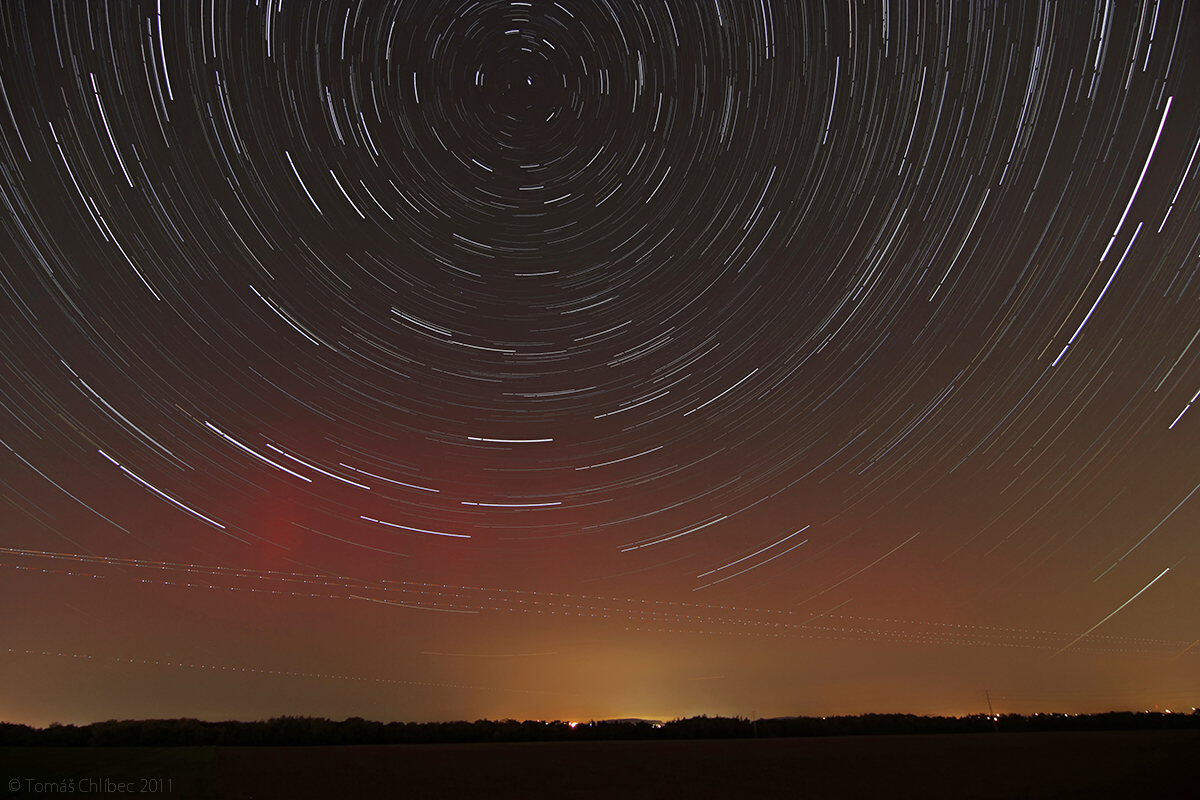Na záčatku bych měl poděkovat Zbyňkovi a Dáše za "rozšíření informace" o polární záři. Díky! Po shlédnutí Zbyňkovy první fotky jsem vystřelil na nejbližší místo s výhledem na sever bez lamp, volba padla na pole v blízkosti parkoviště za Ruzyňským letištěm. Velkou nevýhodou bylo, že jsem vlastně nevěděl, jak bude záře vypadat a nakolik bude intenzivní. Podíval jsem se tedy pomocí fotky s vysokou citlivostí, on přece jen foťák v noci vidí víc než lidské oko, ale žádná záře se nekonala. Jediným, poměrně silným zdrojem světla byl světelný smog z Kralup n. Vltavou severně a Mělníka směr ssv. Nastavil jsem tedy foťák směr "skorosever" a začal vytvářet fotky pro mojí novou oblíbenou fotodisciplínu startrails. Rozdíl v čekání mezi lovem bouřek a chytání polární záře je velký, bouřky vidíte na radaru a můžete sledovat vzdálené záblesky nebo ostatní dění na obloze. To u polární záře nefunguje, takže už po hodině jsem byl neposedný a nevěděl co dělat. Nakonec jsem se usadil v autě a sledoval dění na netu v mobilu, pozoroval přistávající letadla, chvilku hrál hry a tak. No a potom to přišlo. Ve 23:17 jsem na chvíli odlepil oči od rozzářeného displeje mobilu a prví myšlenka byla, že ty Kralupy svítí nějak moc červeně. Přisuzoval jsem to změně vnímání barev po koukání na displej telefonu a čekal, až se oči srovnají. Oči se vzpamatovaly celkem rychle a já už v tu chvíli stál před autem a pozoroval tu nádheru. Opravdu tam byla, krásná červeno-fialová záře která poměrně rychle měnila svůj tvar. Pozorování polární záře a sledování pohybujících se kolmých paprsků bylo jedním z největších zážitků jaký pamatuji, těch 7 minut největší intenzity uteklo ani nevím jak. Podle fotek se záře objevila ve 23.15, největší intenzitu projevila 23.18 - 23.25. Pak zmizely kolmé paprsky a jako červená podlouhlá skvrna začala pomalu slábnout. Poslední znatelné stopy na fotkách jsou ve 23.36. Během záře mi několikrát vypadl mobilní internet (což se u letiště, kde se operátoři perou o nejsilnější signál nestává) a jednou dokonce z ničeho nic i tel. hovor. Nedokážu určit, zda šlo o náhodu nebo vliv změn v magnetickém poli... kdo ví.